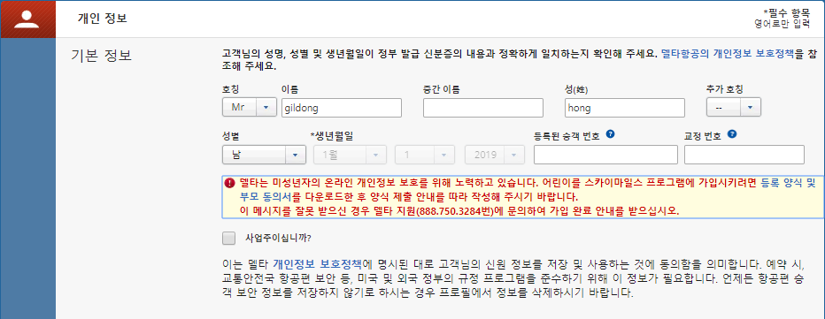 델타는 미성년자의 온라인 개인정보 보호를 위해 노력하고 있습니다. 어린이를 스카이마일스 프로그램에 가입시키려면 등록 양식 및 부모 동의서새 탭에서 열기를 다운로드한 후 양식 제출 안내를 따라 작성해 주시기 바랍니다.
