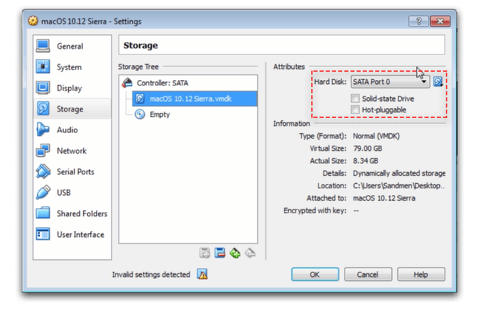 Storage: Finally, choose your macOS 10.12 Sierra.vmdk and make sure that under Attributes, you set the Hard Disk to SATA Port 0. Once done, click OK.