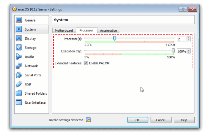 CPU: Select 2 CPU (you can choose more than 2 if you want but it is entirely according to your CPU) and then enable PAE/NX