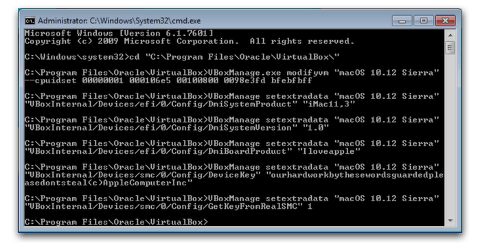 cd "C:\Program Files\Oracle\VirtualBox\" VBoxManage.exe modifyvm "Your VM Name" --cpuidset 00000001 000106e5 00100800 0098e3fd bfebfbff VBoxManage setextradata "Your VM Name" "VBoxInternal/Devices/efi/0/Config/DmiSystemProduct" "iMac11,3" VBoxManage setextradata "Your VM Name" "VBoxInternal/Devices/efi/0/Config/DmiSystemVersion" "1.0" VBoxManage setextradata "Your VM Name" "VBoxInternal/Devices/efi/0/Config/DmiBoardProduct" "Iloveapple" VBoxManage setextradata "Your VM Name" "VBoxInternal/Devices/smc/0/Config/DeviceKey" "ourhardworkbythesewordsguardedpleasedontsteal(c)AppleComputerInc" VBoxManage setextradata "Your VM Name" "VBoxInternal/Devices/smc/0/Config/GetKeyFromRealSMC" 1